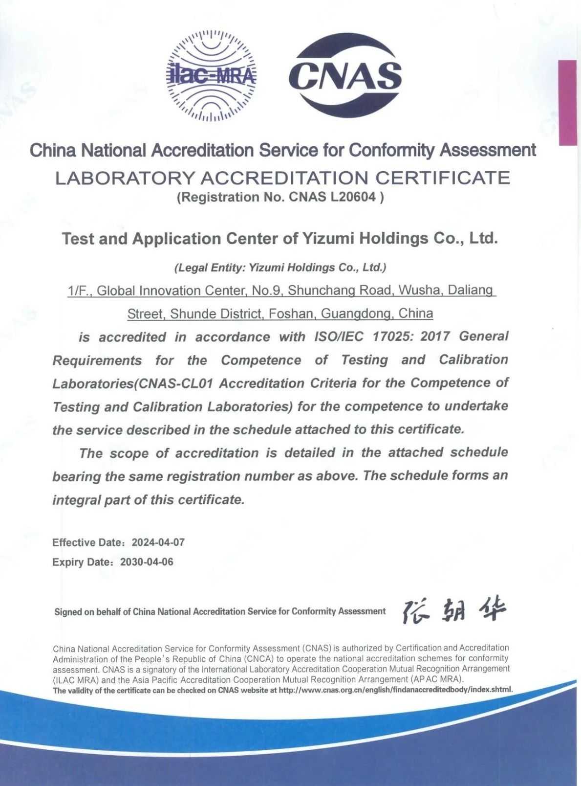 YIZUMI Test and Application Center Has Passed CNAS Accreditation