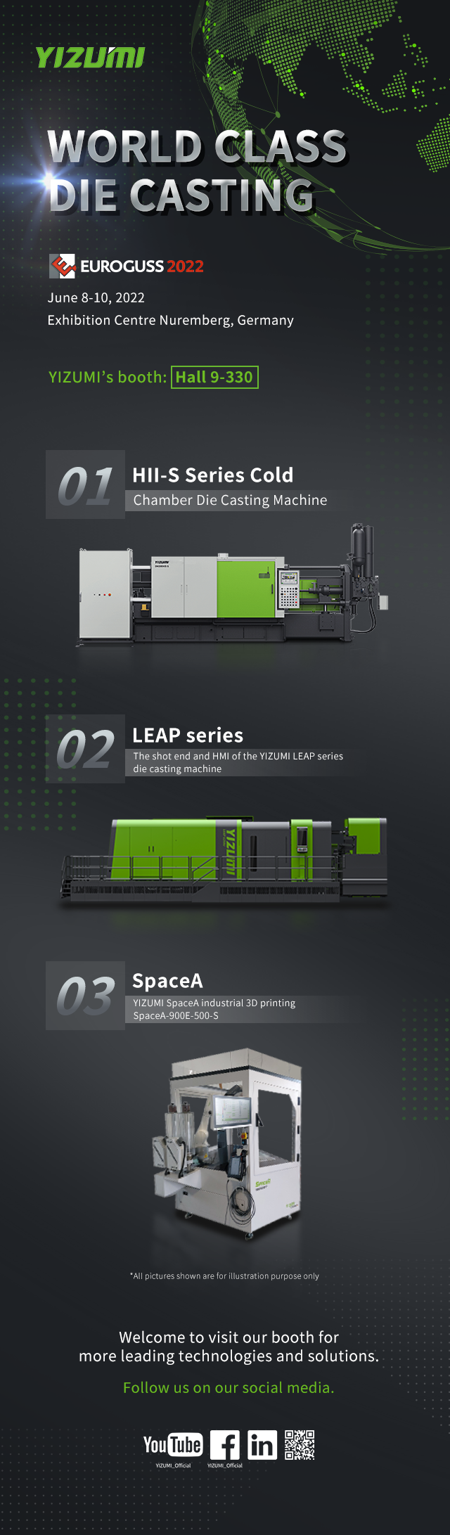 During this year’s Euroguss, YIZUMI will introduce the state-of-the-art LEAP die casting technology with our innovative ORCA control system. Furthermore we will show highlights of our HII-S series cold chamber die casting machine featuring high-performing injection capabilities and the energy-saving YIZUMI hydraulic drive system. At the same time, YIZUMI SpaceA Industrial 3D printer SpaceA-900E-500-S will also be showcased at the exhibition.