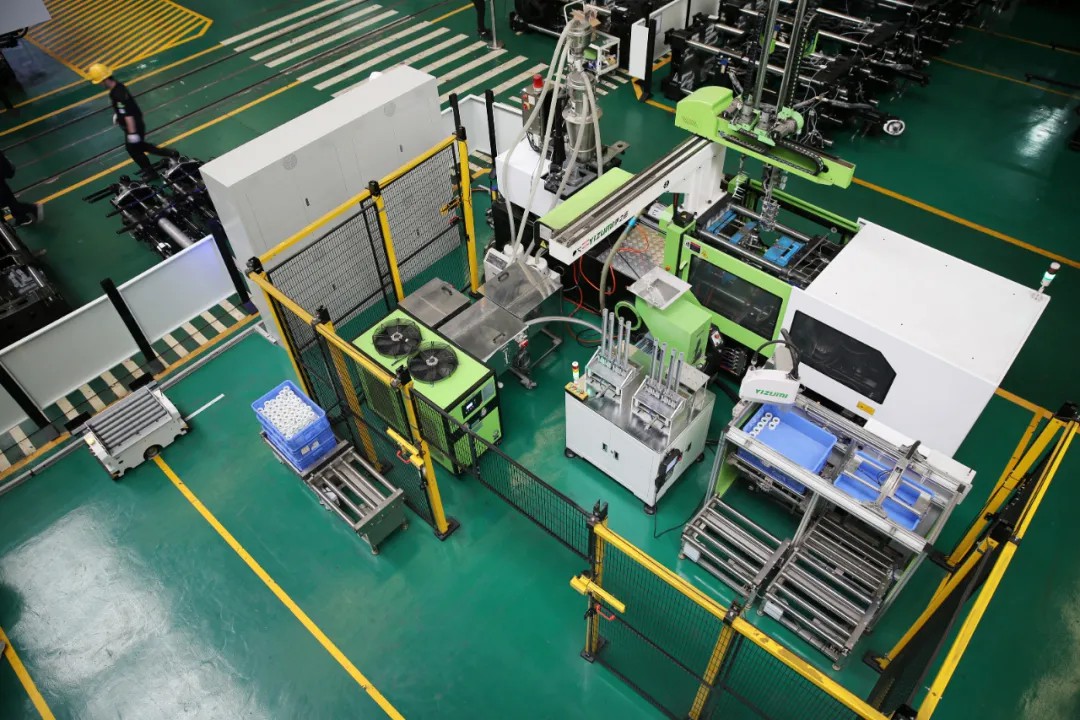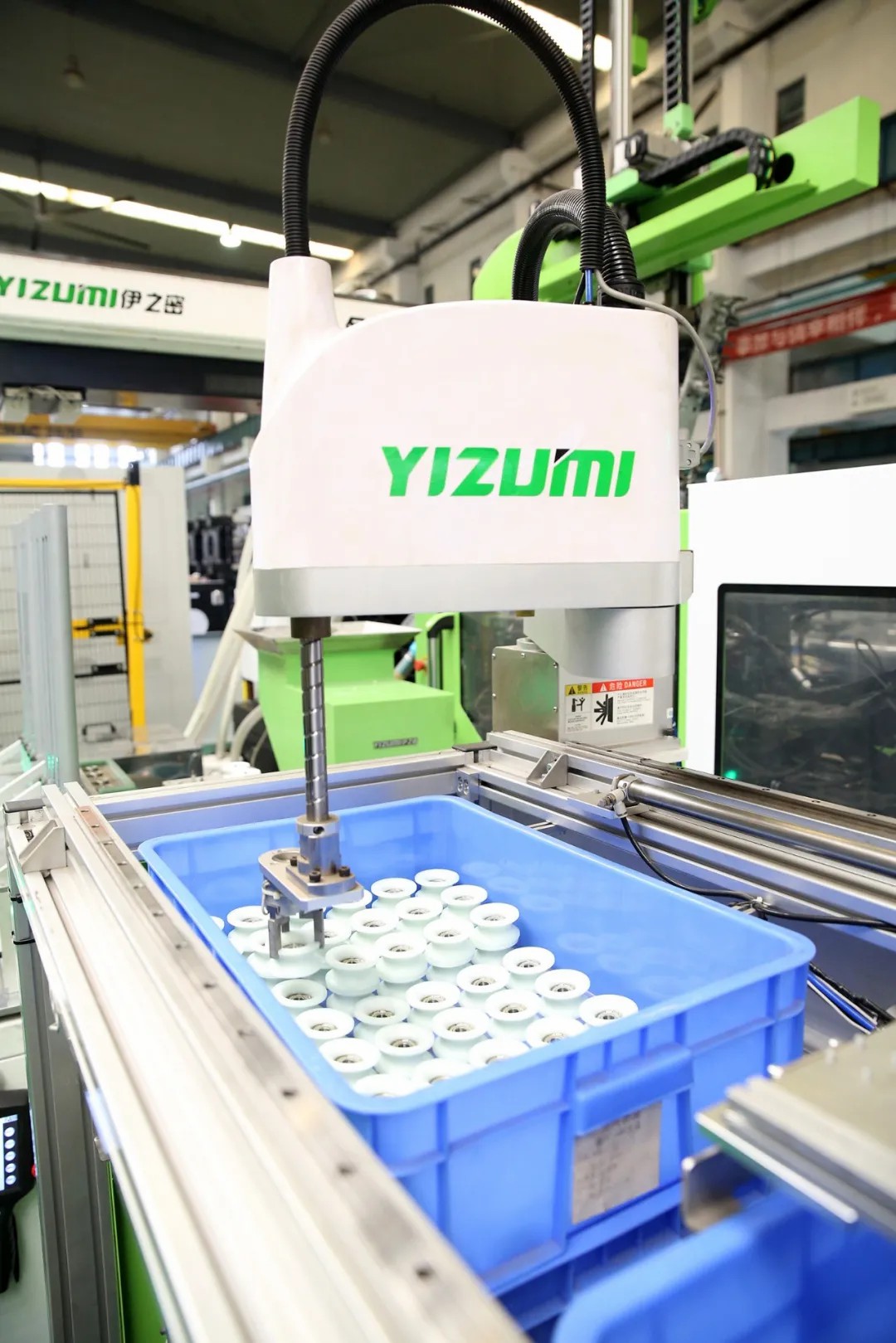 At YIZUMI’s production workshop, there is an automated production line for safety door roller. The entire production process is carried out in automated operations, from raw materials feeding to injection molding, automatic conveying and embedding of bearing inserts, in-mold monitoring, automatic product picking up, packing and placing, warehousing, etc. The rollers produced are used for injection molding machine assembly to achieve self-sufficiency, eliminating the need for external procurement.