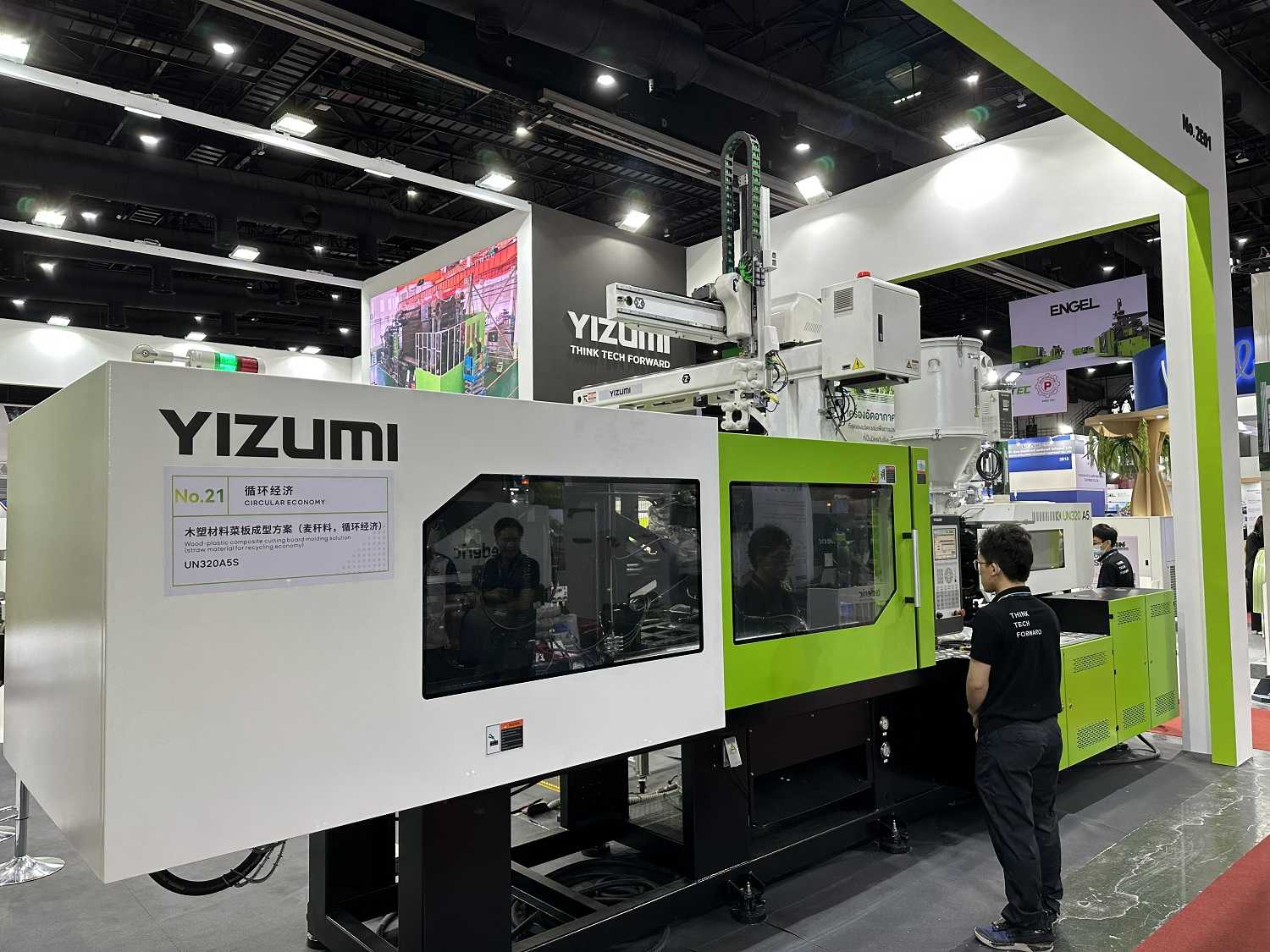 At the exhibition, YIZUMI produces cutting boards and labeled small round bowls with UN320A5 and PAC200E. Particularly, the cutting board molding solution use special screw and barrel for wood-plastic to make household supplies such as cutting boards, reducing the use of plastic and recycling waste materials to achieve low-carbon green production. Many professional visitors are attracted by the machines' highly efficient and stable performance and consult YIZUMI staff about the machines on the spot.