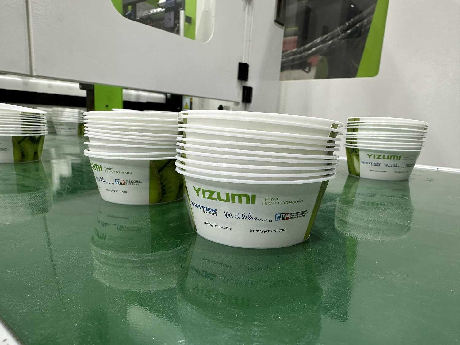 On the spot, YIZUMI integrates with IML (in-mold labeling) system and auxiliary equipment on the basic of PAC200E high speed injection molding machine with a four-cavity mold, realizing the automatic production of labeled small round bowls with a cycle time of 4±0.5s to meet the needs of customers for efficient production and cost reduction.