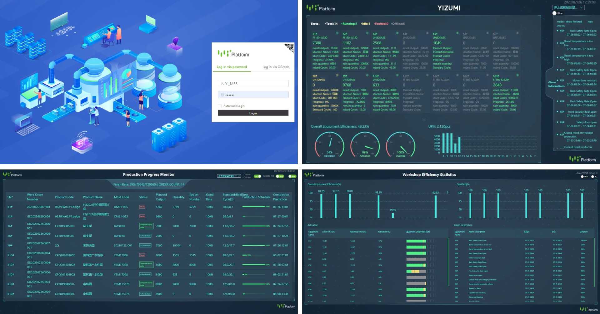 Yi+Platform is used in the polymer material molding industry for production management, which integrates IoT, Cloud, Big Data and other new generation ICT technologies to solve issues such as equipment monitoring, efficiency statistics, equipment maintenance, troubleshooting, process parameter monitoring and traceability, etc., improving production efficiency and product quality. It currently includes two products: Yi MES (Manufacturing Execution System) and Yi CMS (Condition Monitor System).