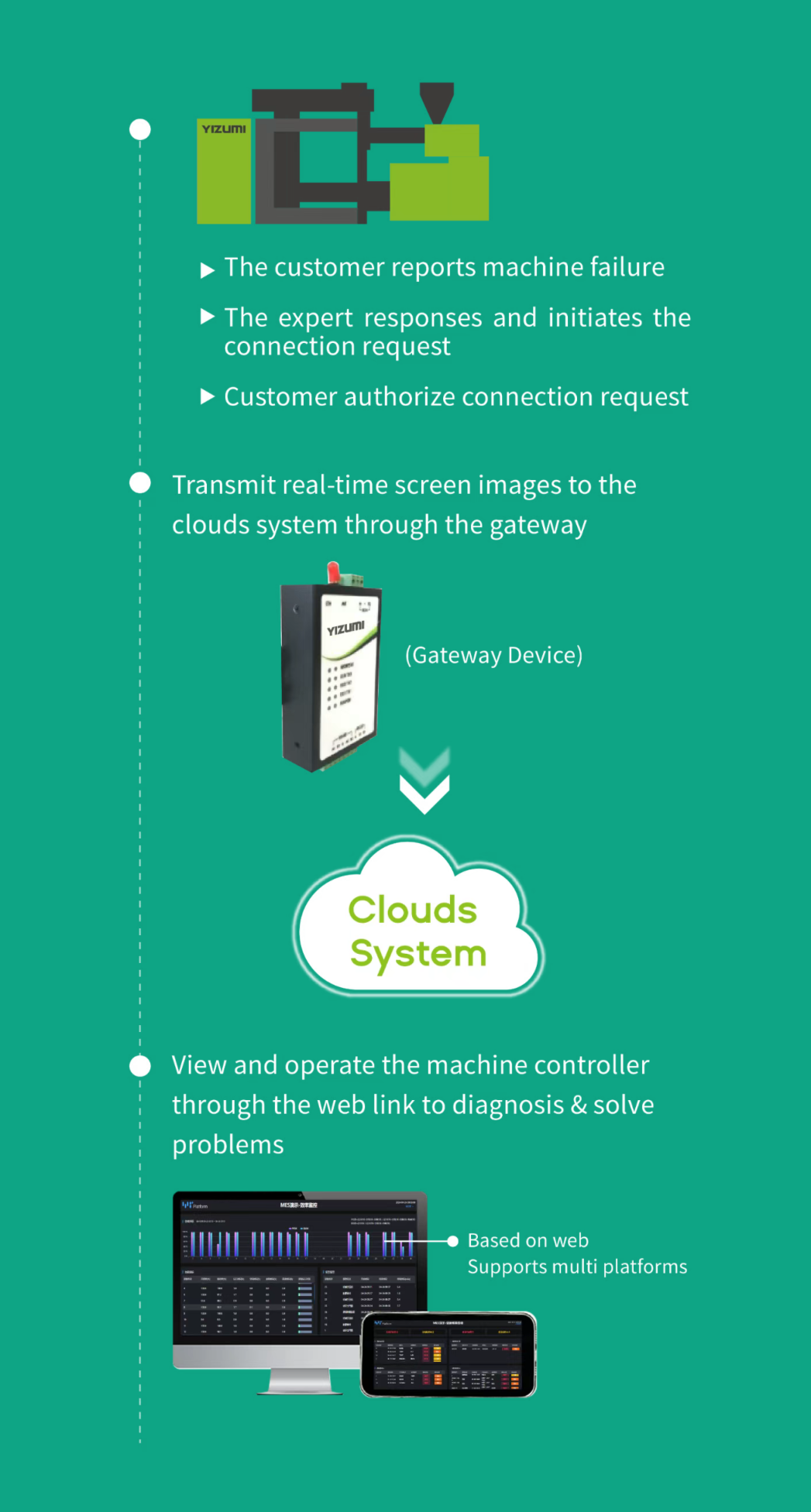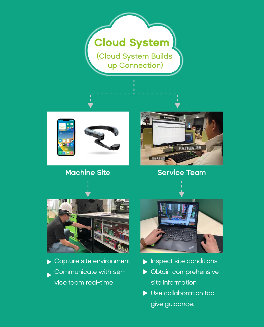 Remote diagnosis focuses on after-sales service, remote adjustment, and fault diagnosis of molding equipment. Based on remote diagnosis systems, it can solve common equipment problems, improve service efficiency, reduce service costs, and empower customers with Total Productive Maintenance system.