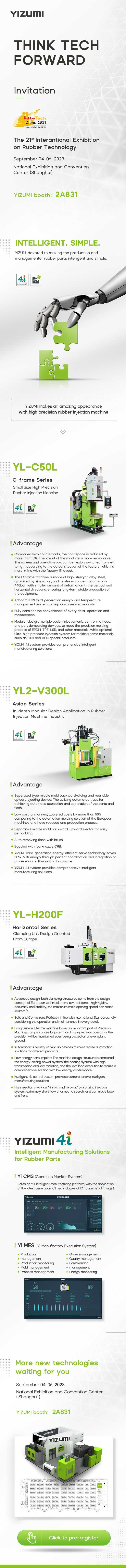 More than 800 enterprises from nearly 30 countries and regions will attend this annual rubber industry event. Yizumi Rubber Machinery Co., Ltd. (YIZUMI) will go all out and demonstrate the C-frame machine YL-C50L, the vertical rubber injection molding machine YL2-V300L and the horizontal rubber injection molding machine YL-H200F to present our latest technology, equipment and related services and to give you an exciting show.