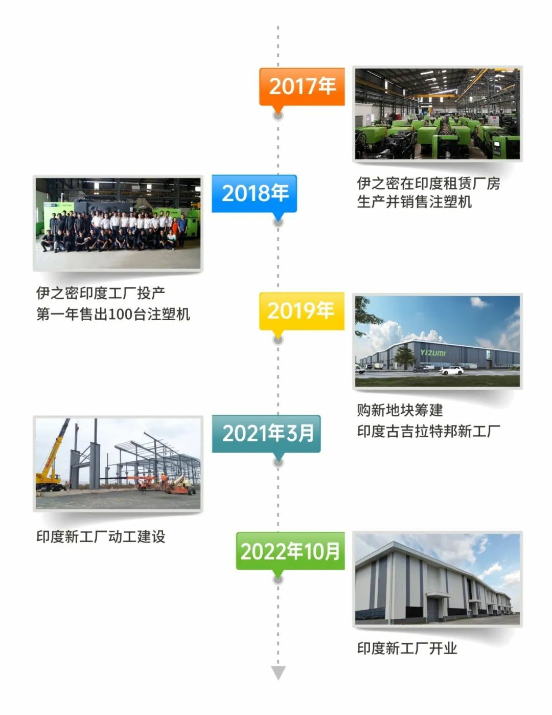 著眼未來印度塑料市場巨大的增長潛力,伊之密積極參與、融入印度市場。自2017年起,伊之密在印度租賃廠房生產并銷售注塑機。憑借過硬的產品質量及成本優勢,迅速在印度市場上建立起良好的口碑,不斷開發新客戶的同時,更獲得很多老客戶的追加訂單。