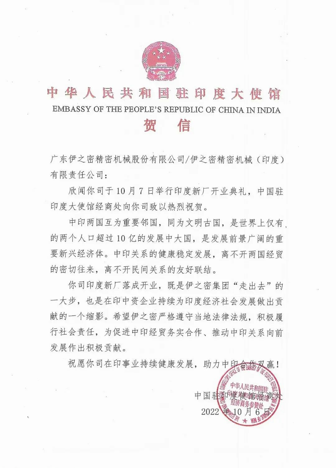 10月7日,伊之密印度新工廠開業慶典在印度古吉拉特邦艾哈邁達巴德隆重舉行,印度政府領導、行業專家、客戶代表、在印友好中資企業及伊之密印度新工廠的員工參加了本次典禮。
