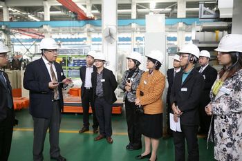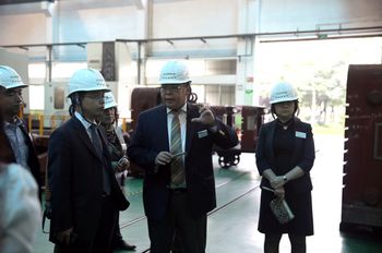 伊之密董事總經(jīng)理甄榮輝(左二)陪同媒體朋友們參觀壓鑄機車間   伊之密董事總經(jīng)理甄榮輝(左二)陪同媒體朋友們參觀橡膠注射機車間