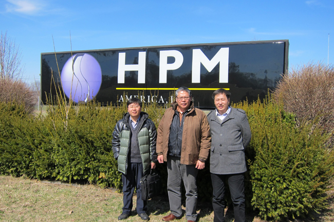 伊之密行政總裁甄榮輝(中)、注塑機事業部副總經理 張濤 (左)、壓鑄機事業部副總經理高潮(右)在美國HPM公司前合影紀念