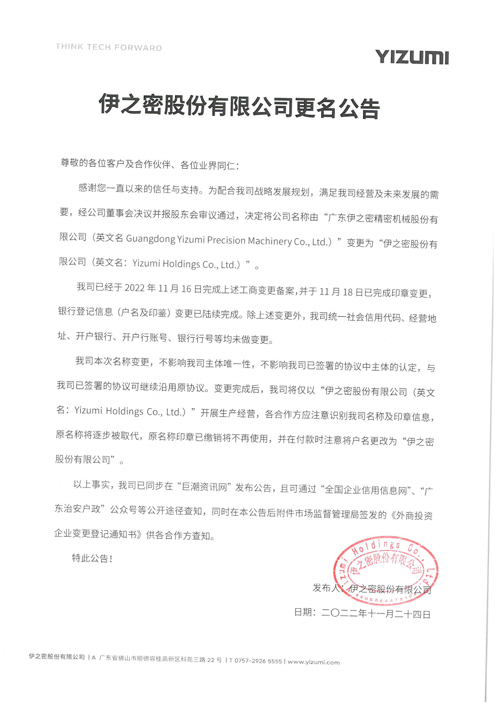 感謝您一直以來的信任與支持。為配合我司戰略發展規劃,滿足我司經營及未來發展的需要,經公司董事會決議并報股東會審議通過,決定將公司名稱由“廣東伊之密精密機械股份有限公司(英文名Guangdong Yizumi Precision Machinery Co., Ltd.)”變更為“伊之密股份有限公司(英文名:Yizumi Holdings Co., Ltd.)”。