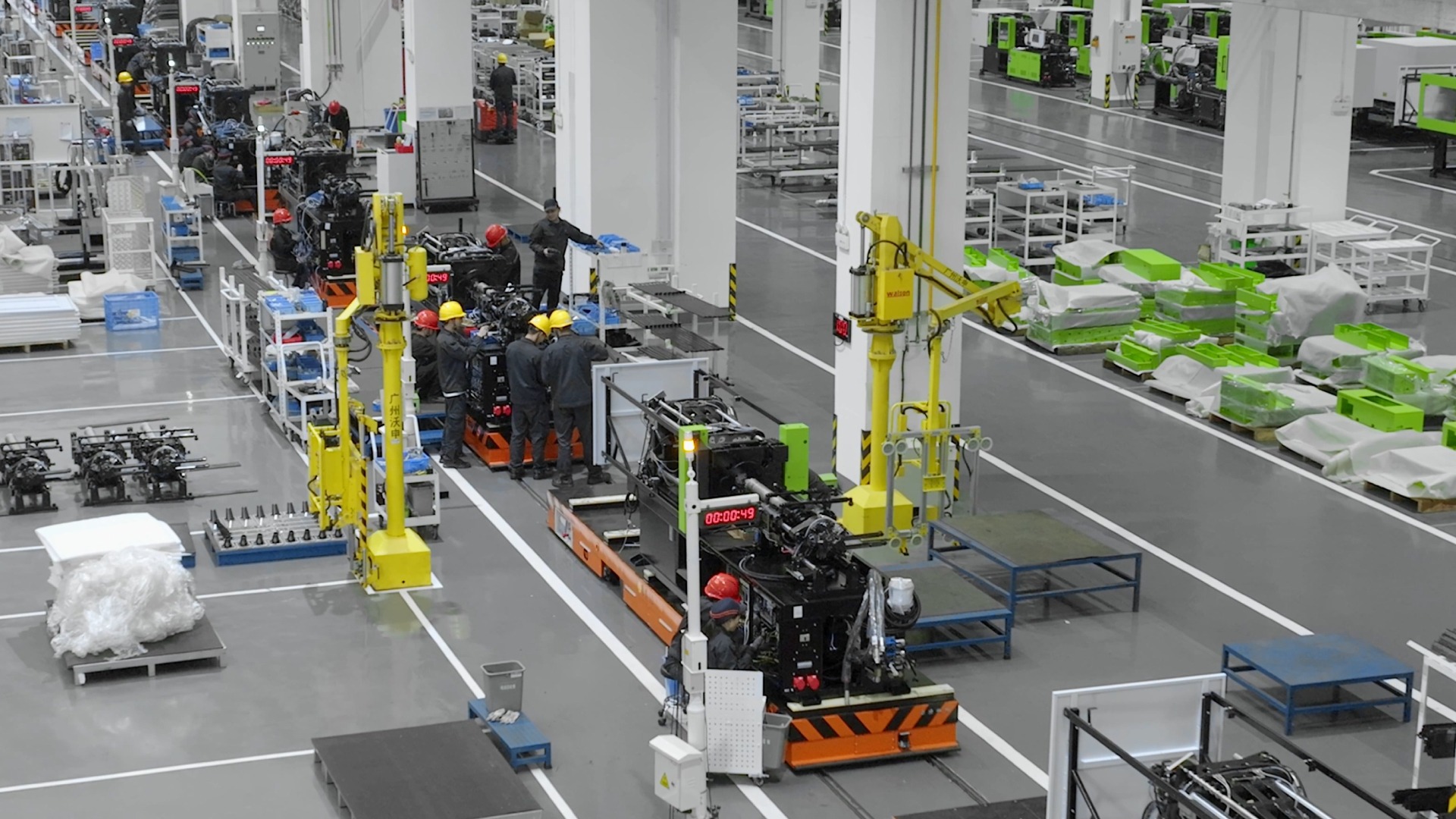 通過整合 FMS 柔性制造系統、自動化物流系統及定制化 MES 生產管理系統,工廠實現 90T-320T 注塑機混線生產,實現生產節拍15 分鐘 / 臺,月產能1000 臺。相較于傳統生產模式,生產周期縮短 30.48%,運營成本降低了 38.18%,用數據詮釋了 “效率革命” 的真正含義。靈活性與智能化的深度融合,是工廠的另一大亮點。預裝區的雙聯動 AGV 方案,讓大型零組件轉運靈活自如;射臺與鎖模組件裝配流水線配備自動化翻轉機構、助力機械手等設備,全員勞動生產率提升了 31.69%;智能中心倉儲通過托舉式 AMR、無人叉車等實現全流程自動化,減少 70% 人力投入,極大提升庫存周轉率。從零部件預裝到整機裝配,智能化設備無縫協作,構建起高效運轉的制造網絡。