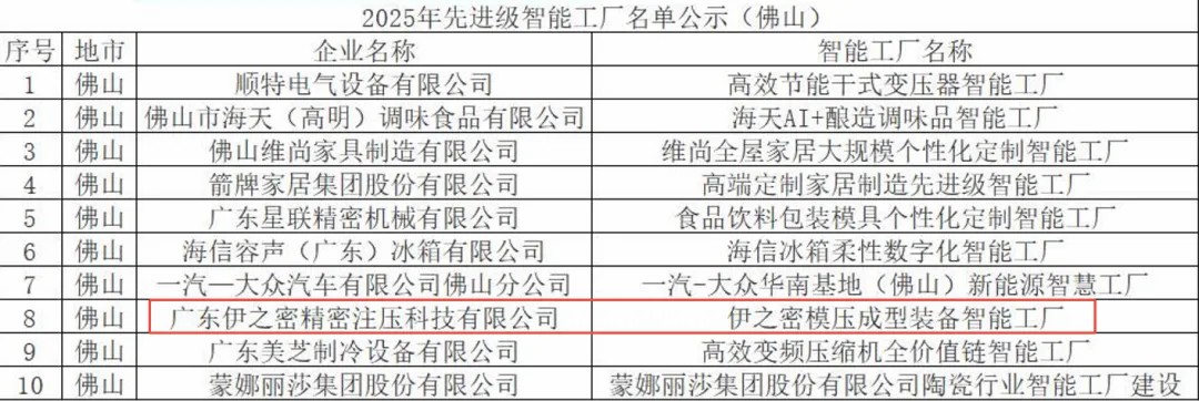 近日,廣東省工業和信息化廳公布了“2025年先進級智能工廠”名單,伊之密模壓成型裝備智能工廠(下稱“伊之密數字化工廠”)憑借其卓越的數字化技術、智能化生產體系和可持續發展理念成功入選。該評定聚焦企業在工廠建設、研發設計、生產作業、生產管理、運營管理等維度的綜合表現,是對智能制造標桿企業的權威認證。這一榮譽不僅是對伊之密在智能制造領域領先地位的認可,更是對公司多年來堅持技術創新、推動行業升級的充分肯定。