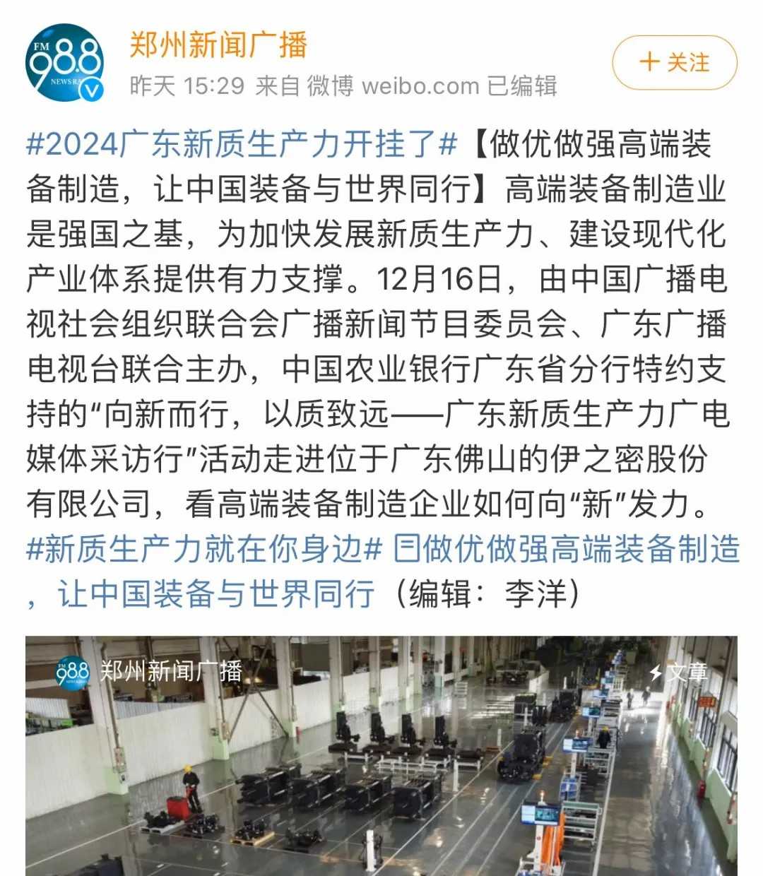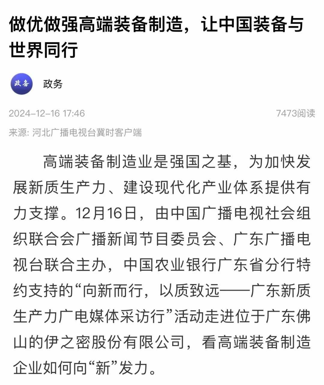 高端裝備制造業(yè)是強(qiáng)國之基,為加快發(fā)展新質(zhì)生產(chǎn)力、構(gòu)建現(xiàn)代化產(chǎn)業(yè)體系提供有力支撐。12月16日,由中國廣播電視社會(huì)組織聯(lián)合會(huì)廣播新聞節(jié)目委員會(huì)與廣東廣播電視臺(tái)聯(lián)合主辦的“向新而行,以質(zhì)致遠(yuǎn)——廣東新質(zhì)生產(chǎn)力廣電媒體采訪行”活動(dòng)走進(jìn)伊之密股份有限公司(以下簡稱:伊之密),探訪高端裝備制造企業(yè)如何向“新”發(fā)力。