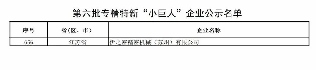 近日,工業(yè)和信息化部公布第六批國家級專精特新“小巨人”企業(yè)名單,伊之密精密機械(蘇州)有限公司(簡稱:蘇州伊之密)名列其中。