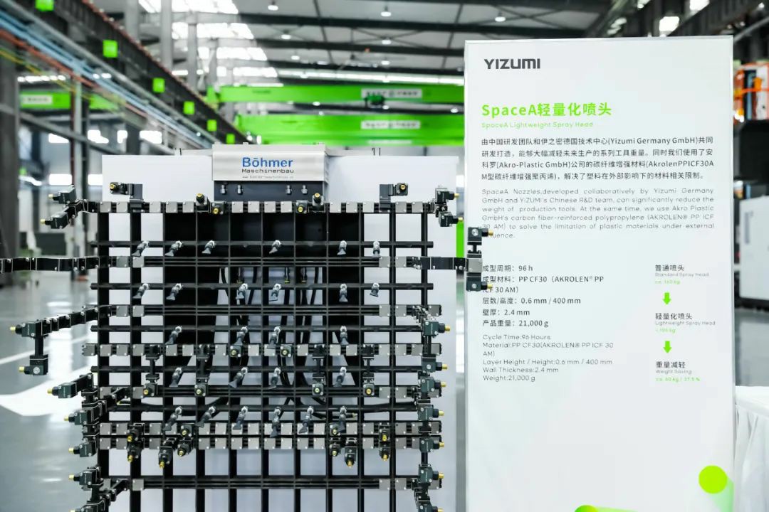 SpaceA輕量化噴頭,由中國研發團隊和伊之密德國技術中心共同研發打造,能夠大幅減輕未來生產的系列工具的重量。同時我們使用了安科羅(Akro-Plastic GmbH)公司的碳纖維增強材料(AkrolenPPICF30AM型碳纖維增強聚丙烯),解決了塑料在外部影響下產生的相關限制。