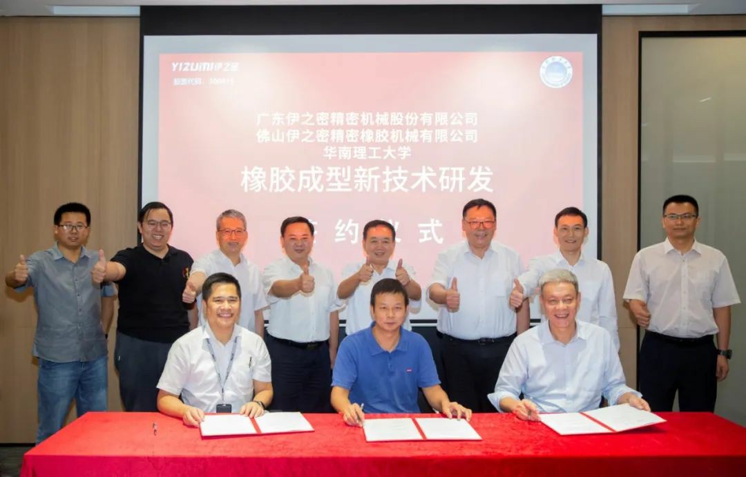 華南理工大學聚合物新型成型裝備國家工程研究中心常務副主任何和智教授、殷小春教授、伊之密董事副總經理余焯焜先生、伊之密橡膠機事業部總經理王詩海先生等領導出席簽約儀式。