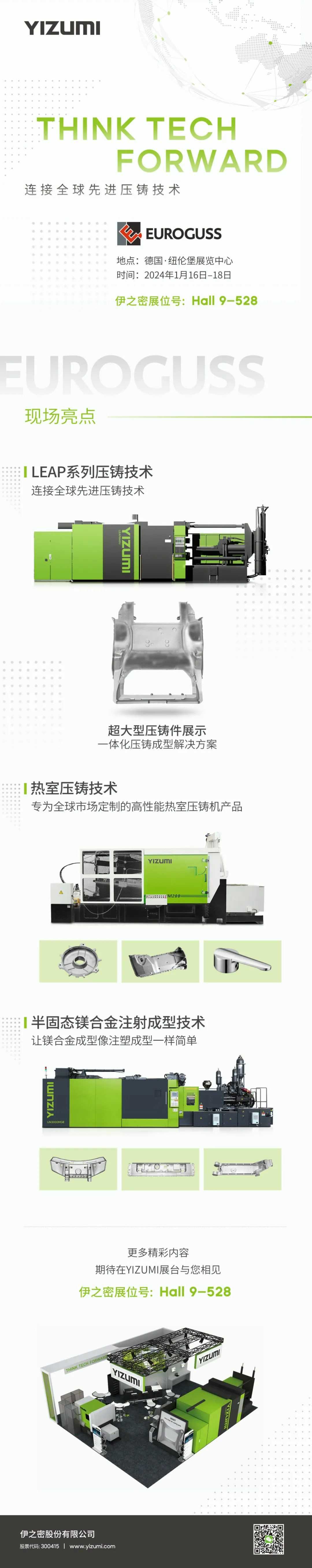 作為深耕多領域成型裝備的全球化企業,伊之密于2022年首次參展EUROGUSS并展出了LEAP系列壓射端和控制系統。本屆展會,伊之密將攜LEAP系列530U、高性能熱室壓鑄機HM90T及先進壓鑄技術亮相EUROGUSS。