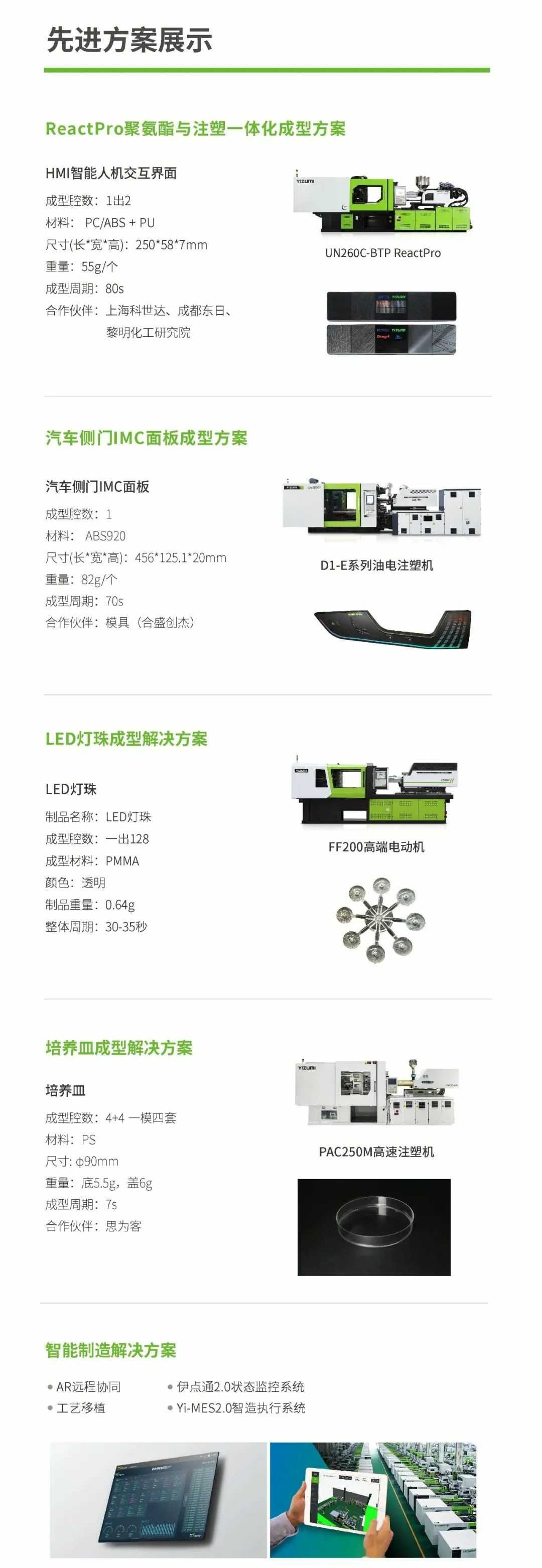 作為先進的成型裝備系統(tǒng)服務商,伊之密致力于向各類客戶提供優(yōu)質、定制化的注塑成型解決方案。展會期間,伊之密將攜同ReactPro聚氨酯與注塑一體化成型、LED燈珠成型、汽車側門IMC面板成型、培養(yǎng)皿成型、智能制造解決方案等不同創(chuàng)新性解決方案,與大家現(xiàn)場交流。屆時,技術專家團隊將現(xiàn)場詳細介紹伊之密的產品和服務,并解答各方客戶的疑問和需求。