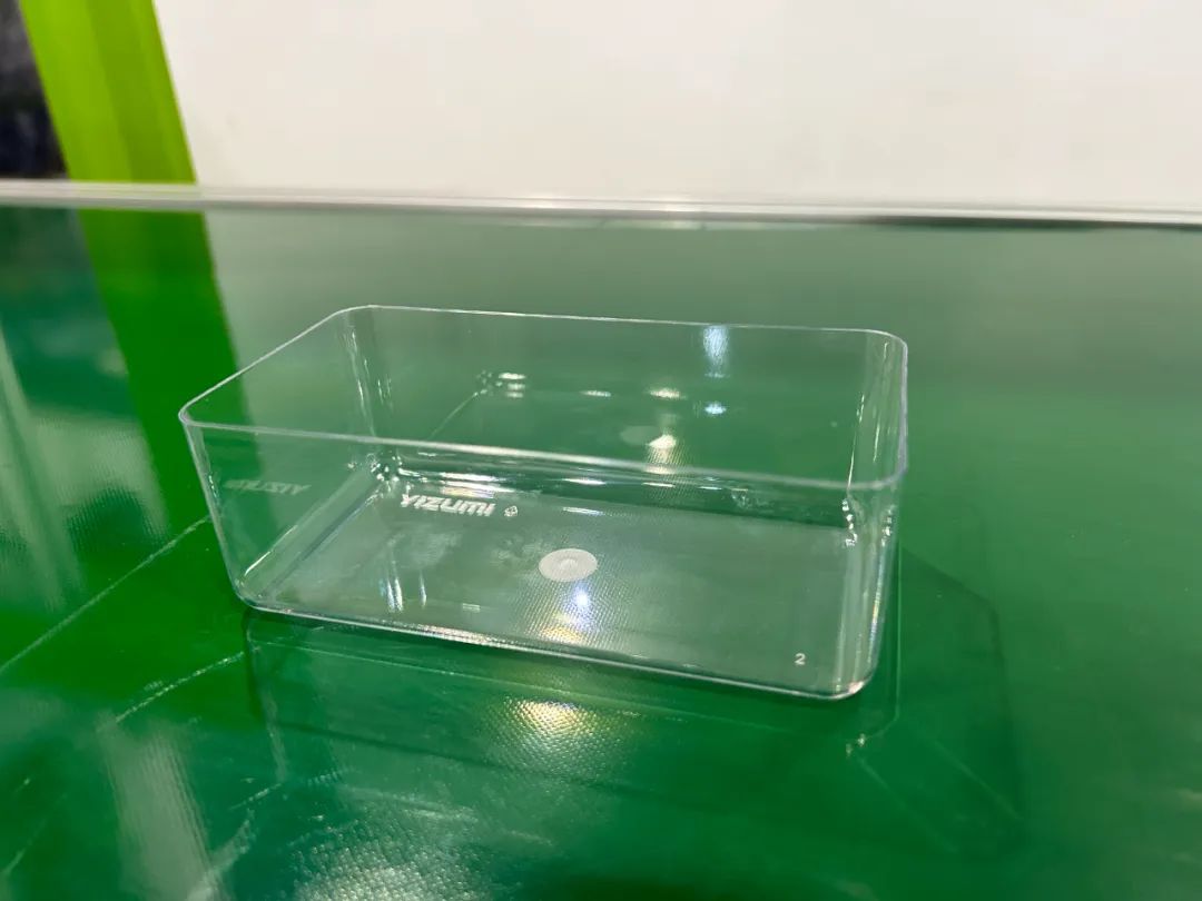 伊之密PAC250薄壁高速注塑機搭載了全新研發的PET薄壁包裝盒成型模具。相比傳統薄壁注塑產品采用PS或其他材料制作,PET材料制作的包裝盒子質感更高,材料環保易回收、價格更低,為客戶提供一個新的包裝設計思路。