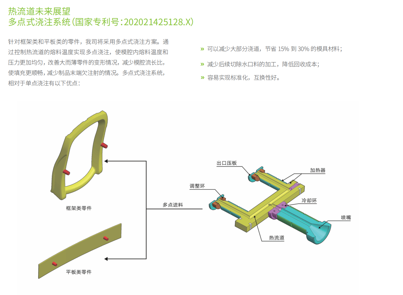 隨著市場對大型輕量化零件的需求增長,漿料流長和單料管注射量將會是半固態鎂合金注射成型制造大型輕量化零件的阻礙,而伊之密專利——《多點熱流道技術》可以將這阻礙輕松突破。